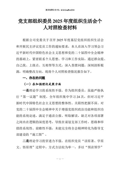 【七哥公文】2026年:党支部组织委员2025年度组织生活会个人对照检查材料+更多免费公文+VX:QiGeGongWen2024
