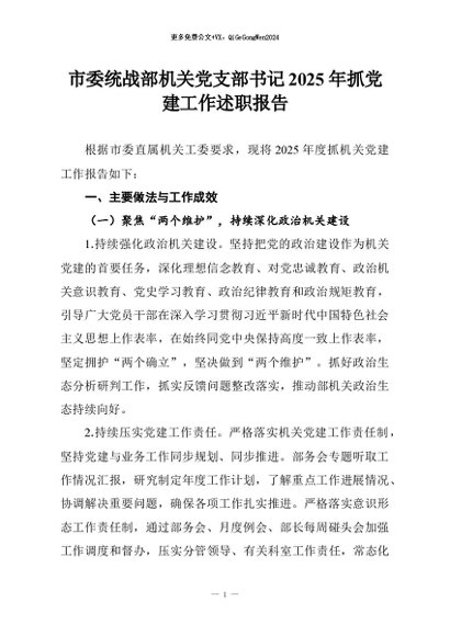 【七哥公文】2026年:市委统战部机关党支部书记2025年抓党建工作述职报告+更多免费公文+VX:QiGeGongWen2024