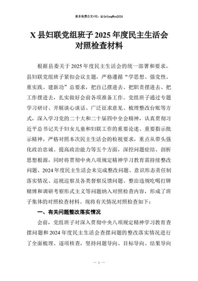 【七哥公文】2026年:X县妇联党组班子2025年度民主生活会对照检查材料+更多免费公文+VX:QiGeGongWen2024