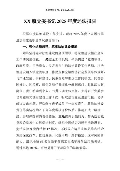 【七哥公文】2026年:XX镇党委书记2025年度述法报告+更多免费公文+VX:QiGeGongWen2024