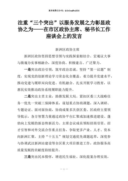 【七哥公文】2026年:注重“三个突出”以服务发展之力彰显政协之为——在市区政协主席、秘书长工作座谈会上的发言+更多免费公文+VX:QiGeGongWen2024