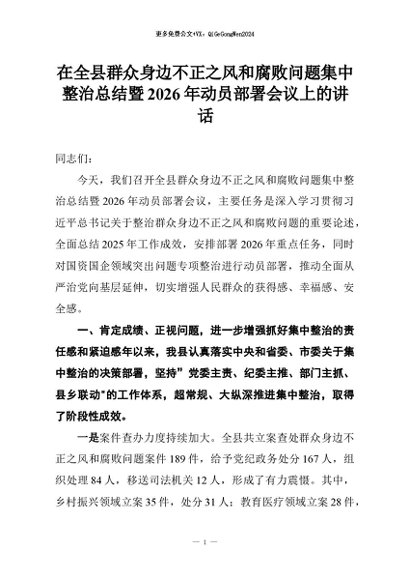 【七哥公文】2026年:在全县群众身边不正之风和腐败问题集中整治总结暨2026年动员部署会议上的讲话+更多免费公文+VX:QiGeGongWen2024