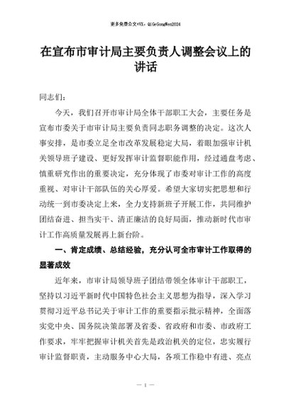 / 【七哥公文】2026年:在宣布市审计局主要负责人调整会议上的讲话+更多免费公文+VX:QiGeGongWen2024