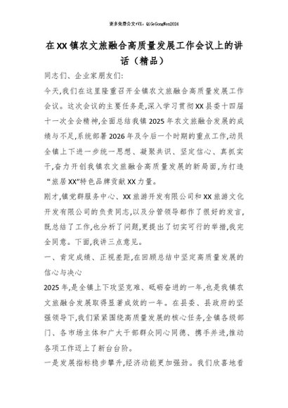 【七哥公文】2026年:在XX镇农文旅融合高质量发展工作会议上的讲话(精品)_副本+更多免费公文+VX:QiGeGongWen2024