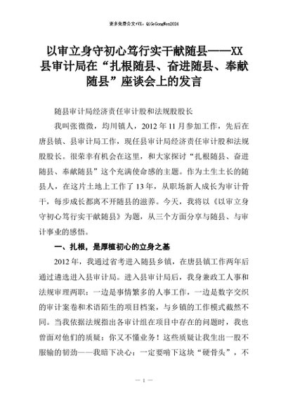 【七哥公文】2026年:以审立身守初心笃行实干献随县——XX县审计局在“扎根随县、奋进随县、奉献随县”座谈会上的发言+更多免费公文+VX:QiGeGongWen2024 - 七哥-AI智库