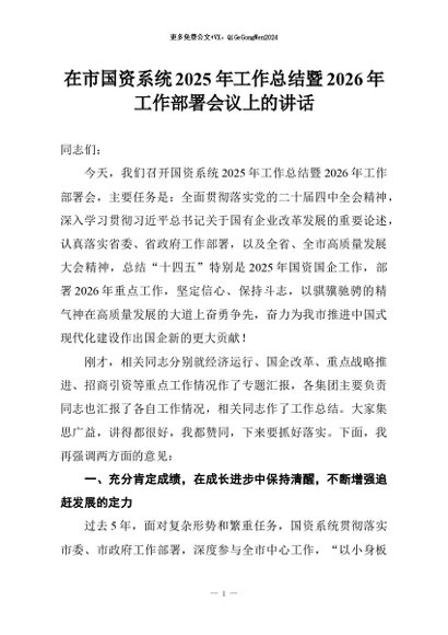 【七哥公文】2026年:在市国资系统2025年工作总结暨2026年工作部署会议上的讲话+更多免费公文+VX:QiGeGongWen2024 - 七哥-AI智库