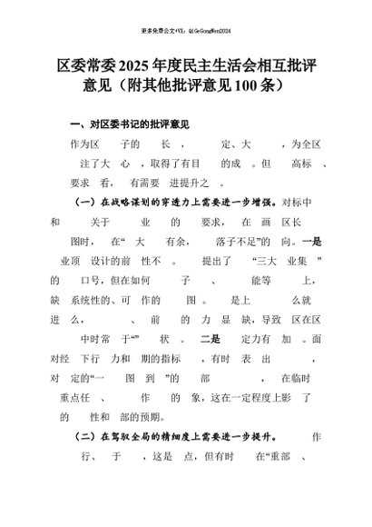 【七哥公文】2026年:区委常委2025年度民主生活会相互批评意见(附其他批评意见100条)+更多免费公文+VX:QiGeGongWen2024
