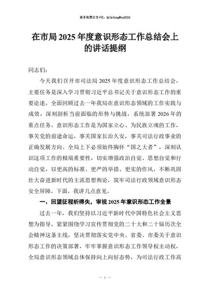 【七哥公文】2026年:在市局2025年度意识形态工作总结会上的讲话提纲+更多免费公文+VX:QiGeGongWen2024