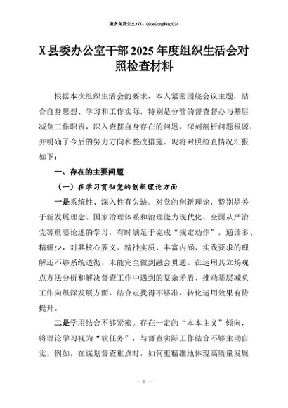 【七哥公文】2026年:X县委办公室干部2025年度组织生活会对照检查材料+更多免费公文+VX:QiGeGongWen2024