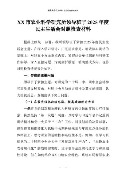 【七哥公文】2026年:XX市农业科学研究所领导班子2025年度民主生活会对照检查材料+更多免费公文+VX:QiGeGongWen2024