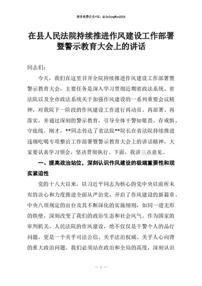 【七哥公文】2026年:在县人民法院持续推进作风建设工作部署暨警示教育大会上的讲话+更多免费公文+VX:QiGeGongWen2024