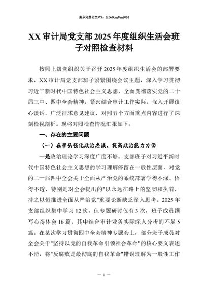 【七哥公文】2026年:XX审计局党支部2025年度组织生活会班子对照检查材料+更多免费公文+VX:QiGeGongWen2024