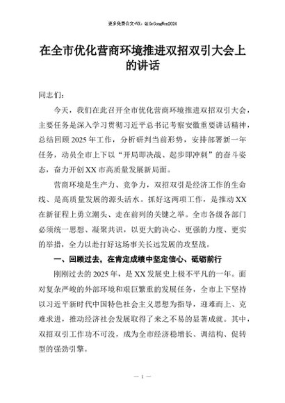 / 【七哥公文】2026年:在全市优化营商环境推进双招双引大会上的讲话+更多免费公文+VX:QiGeGongWen2024