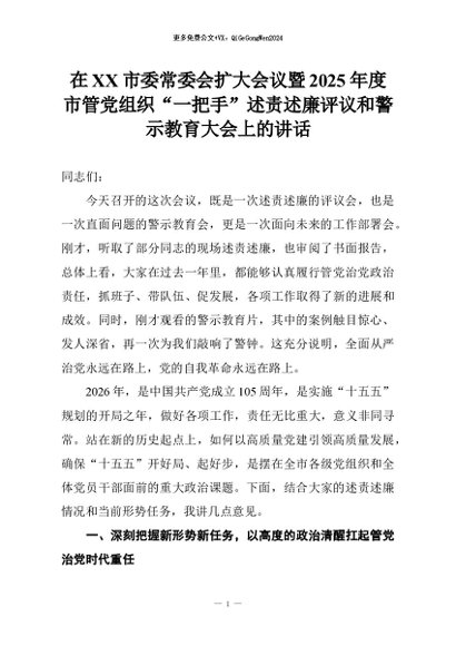 【七哥公文】2026年:在XX市委常委会扩大会议暨2025年度市管党组织“一把手”述责述廉评议和警示教育大会上的讲话+更多免费公文+VX:QiGeGongWen2024