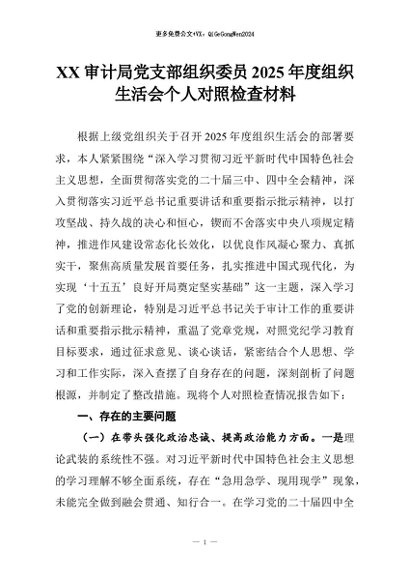 【七哥公文】2026年:XX审计局党支部组织委员2025年度组织生活会个人对照检查材料+更多免费公文+VX:QiGeGongWen2024