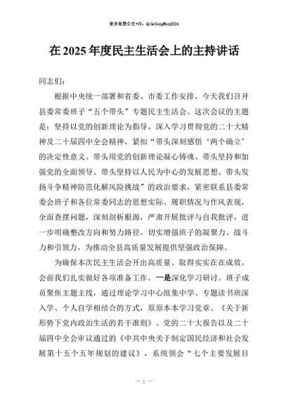 / 【七哥公文】2026年:在2025年度民主生活会上的主持讲话+更多免费公文+VX:QiGeGongWen2024