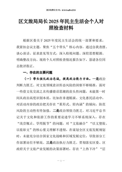 【七哥公文】2026年:区文旅局局长2025年民主生活会个人对照检查材料+更多免费公文+VX:QiGeGongWen2024