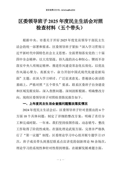 【七哥公文】2026年:区委领导班子2025年度民主生活会对照检查材料(五个带头)+更多免费公文+VX:QiGeGongWen2024