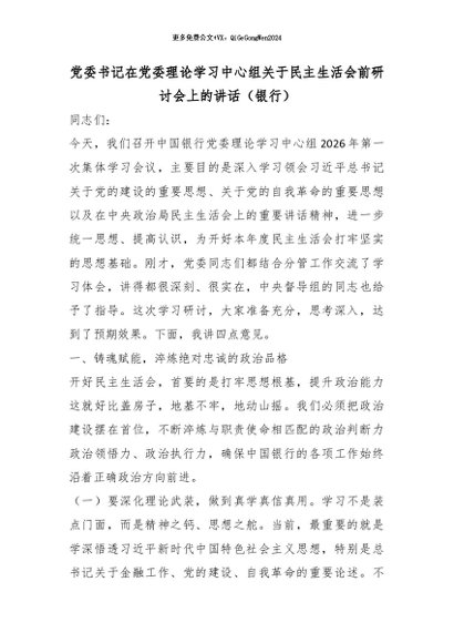 【七哥公文】2026年:党委书记在党委理论学习中心组关于民主生活会前研讨会上的讲话(银行)_副本+更多免费公文+VX:QiGeGongWen2024