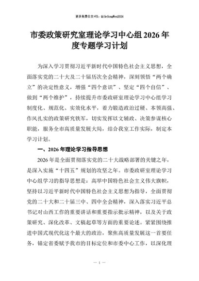 【七哥公文】2026年:市委政策研究室理论学习中心组2026年度专题学习计划+更多免费公文+VX:QiGeGongWen2024