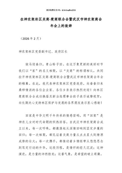 【七哥公文】2026年:在神农架林区炎商·楚商联合会暨武汉市神农架商会年会上的致辞_副本+更多免费公文+VX:QiGeGongWen2024