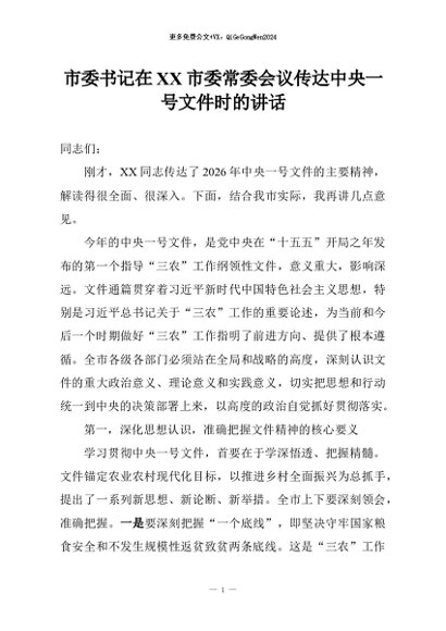 【七哥公文】2026年:市委书记在XX市委常委会议传达中央一号文件时的讲话+更多免费公文+VX:QiGeGongWen2024 - 七哥-AI智库