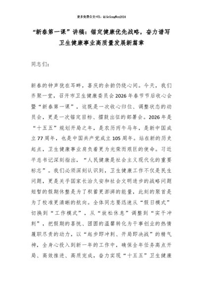 【七哥公文】2026年:“新春第一课”讲稿:锚定健康优先战略,奋力谱写卫生健康事业高质量发展新篇章_副本+更多免费公文+VX:QiGeGongWen2024
