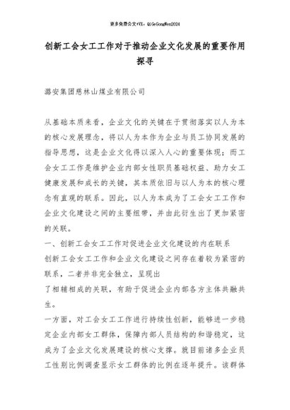 【七哥公文】2026年:创新工会女工工作对于推动企业文化发展的重要作用探寻_副本+更多免费公文+VX:QiGeGongWen2024