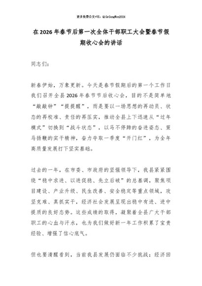 【七哥公文】2026年:在2026年春节后第一次全体干部职工大会暨春节假期收心会的讲话_副本+更多免费公文+VX:QiGeGongWen2024