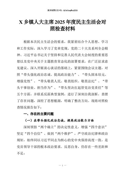 【七哥公文】2026年:X乡镇人大主席2025年度民主生活会对照检查材料+更多免费公文+VX:QiGeGongWen2024