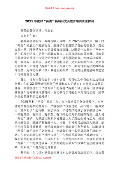 【七哥公文】2026年:2025年度村“两委”换届后党员教育培训班主持词+更多免费公文+VX:QiGeGongWen2024