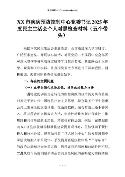 【七哥公文】2026年:XX市疾病预防控制中心党委书记2025年度民主生活会个人对照检查材料(五个带头)+更多免费公文+VX:QiGeGongWen2024
