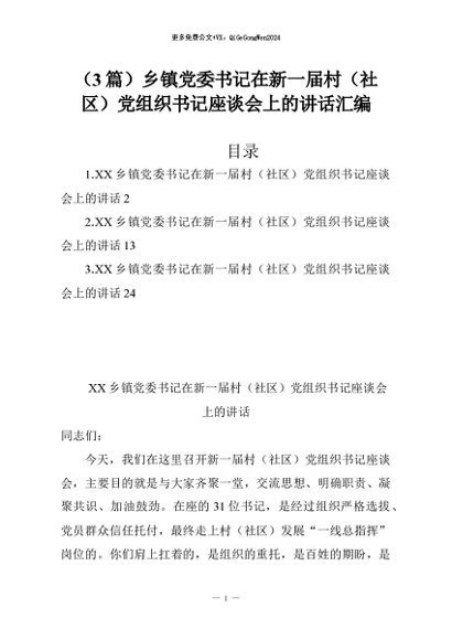 【七哥公文】2026年:(3篇)乡镇党委书记在新一届村(社区)党组织书记座谈会上的讲话汇编+更多免费公文+VX:QiGeGongWen2024