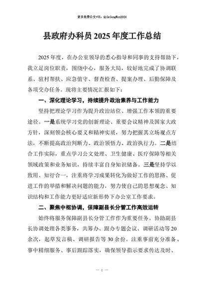 / 【七哥公文】2026年:县政府办科员2025年度工作总结+更多免费公文+VX:QiGeGongWen2024