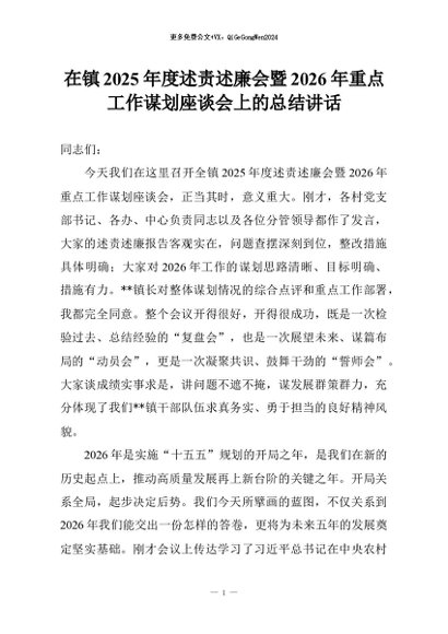 【七哥公文】2026年:在镇2025年度述责述廉会暨2026年重点工作谋划座谈会上的总结讲话+更多免费公文+VX:QiGeGongWen2024