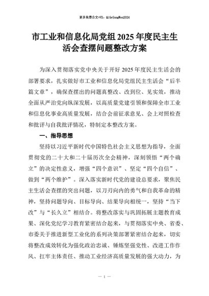 【七哥公文】2026年:市工业和信息化局党组2025年度民主生活会查摆问题整改方案+更多免费公文+VX:QiGeGongWen2024