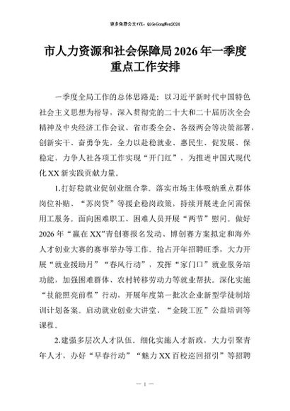 【七哥公文】2026年:市人力资源和社会保障局2026年一季度重点工作安排+更多免费公文+VX:QiGeGongWen2024