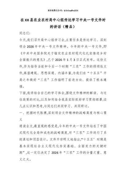 【七哥公文】2026年:在XX县农业农村局中心组传达学习中央一号文件时的讲话(精品)_副本+更多免费公文+VX:QiGeGongWen2024