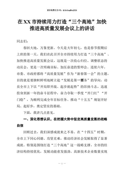 【七哥公文】2026年:在XX市持续用力打造“三个高地”加快推进高质量发展会议上的讲话+更多免费公文+VX:QiGeGongWen2024