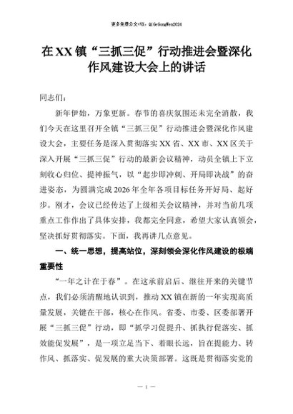 【七哥公文】2026年:在XX镇“三抓三促”行动推进会暨深化作风建设大会上的讲话+更多免费公文+VX:QiGeGongWen2024