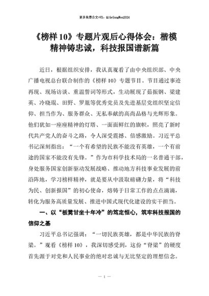 【七哥公文】2026年:《榜样10》专题片观后心得体会:楷模精神铸忠诚,科技报国谱新篇+更多免费公文+VX:QiGeGongWen2024