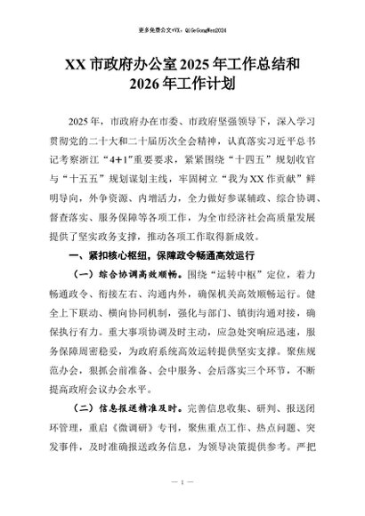 【七哥公文】2026年:XX市政府办公室2025年工作总结和2026年工作计划+更多免费公文+VX:QiGeGongWen2024