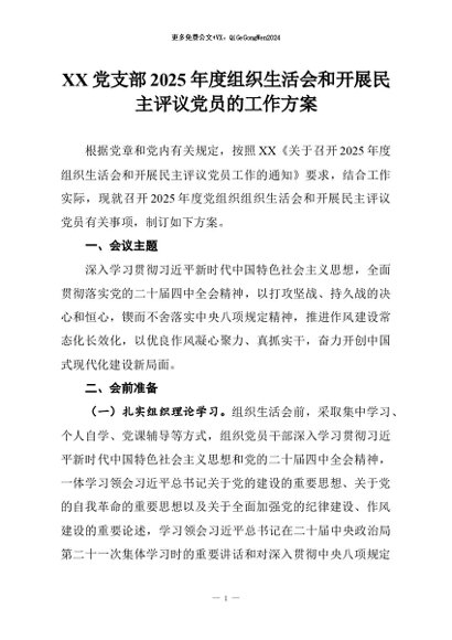 【七哥公文】2026年:XX党支部2025年度组织生活会和开展民主评议党员的工作方案+更多免费公文+VX:QiGeGongWen2024