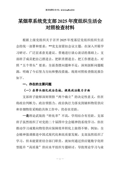 【七哥公文】2026年:某烟草系统党支部2025年度组织生活会对照检查材料+更多免费公文+VX:QiGeGongWen2024