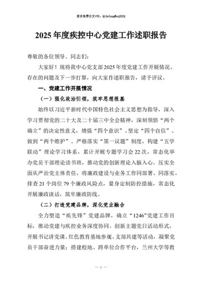 / 【七哥公文】2026年:2025年度疾控中心党建工作述职报告+更多免费公文+VX:QiGeGongWen2024