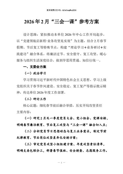 / 【七哥公文】2026年:2026年2月“三会一课”参考方案+更多免费公文+VX:QiGeGongWen2024