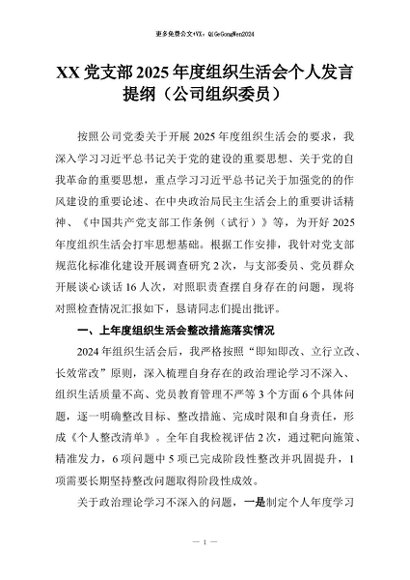 【七哥公文】2026年:XX党支部2025年度组织生活会个人发言提纲(公司组织委员)+更多免费公文+VX:QiGeGongWen2024