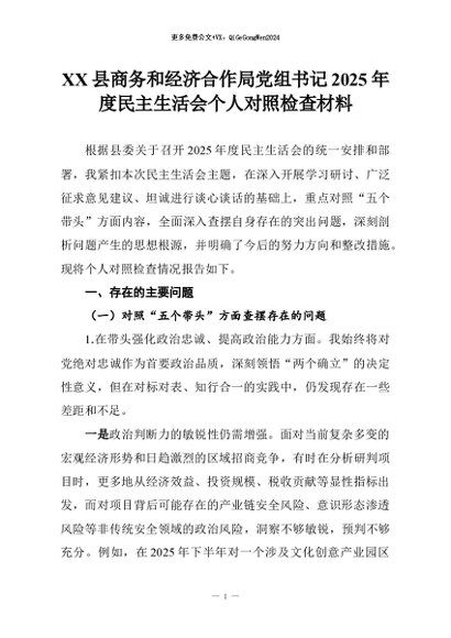 【七哥公文】2026年:XX县商务和经济合作局党组书记2025年度民主生活会个人对照检查材料+更多免费公文+VX:QiGeGongWen2024