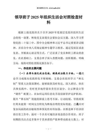 【七哥公文】2026年:领导班子2025年组织生活会对照检查材料+更多免费公文+VX:QiGeGongWen2024