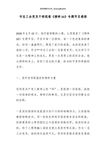 【七哥公文】2026年:市总工会党员干部观看《榜样10》专题节目感悟+更多免费公文+VX:QiGeGongWen2024